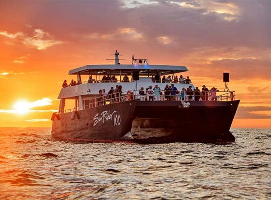 Enjoy a beautiful evening aboard the Sun Rider 100, a luxurious 100 ft double deck Catamaran with 9 restrooms separated for both men and women, dance floor and 360° ocean views. Join us and tour the famous Arch of Cabo San Lucas, the colony of sea lions, Lovers beach, Lands’ end and their stunning rock formations. While enjoying a delicious Mexican buffet prepared by our chef aboard, accompanied with freshly mixed drinks from our open bar.